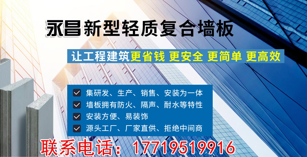 西安永昌环保建材有限公司是一家专业生产、销售、安装新型环保隔墙板的厂家,主要产品有复合隔墙板、轻质隔墙板、石膏隔墙板、陶粒隔墙板等环保墙板和建材。